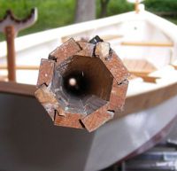 Mast building? More like kindling making. On this try selected 2 2x10x16 DF from a local lumber yard, trying to quickly access the quality while under the supervision of a yard helper. A year later, I rip, plane, birdsmouth and assemble only to back off before gluing as the knots seemed too iffy. So another lumber yard, this time 1x3 construction spruce, ripped, planed, BM. Bottom line I ended up using 2 DF and 6 spruce staves. One funky mast. But I did overbuild by 50% since it is unstayed.