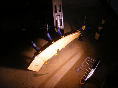 When I got to bow the glued scarf failed! Here I am trying another weak attempt to get it right, but it failed also. I ended fastening and epoxying it in place, came out close.